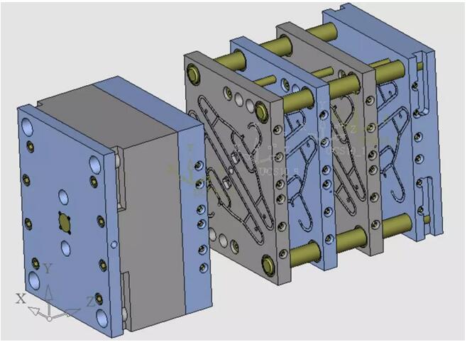 由于這一個(gè)模塊二面的型腔是完全一樣的,在注塑時(shí)模塊的二面受到的作用力是一樣的,并且力的方向相反,合力為零。就是這樣一個(gè)簡(jiǎn)單的原理,使得四層模具的鎖模力僅僅和一層的模具相等。