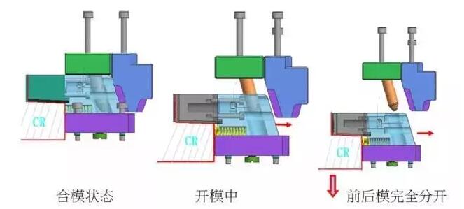 在塑料模具中,利用成型的開模動作,使斜撐梢與滑塊產(chǎn)生相對運(yùn)動趨勢,使滑塊沿開模方向及水平方向的兩種運(yùn)動形式,使之脫離倒勾。如下圖所示: