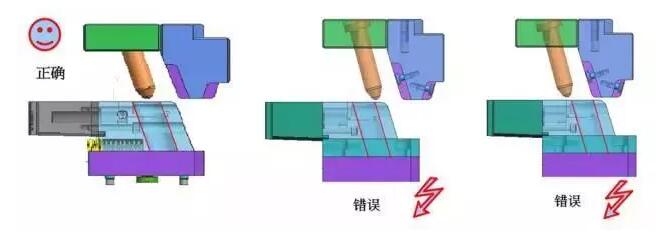 滑塊在開模過程中要運(yùn)動一定距離,前后模完全分開后,要使滑塊能夠安全回位。滑塊要停在正確的位置,如果滑塊再往前或向后滑行,會導(dǎo)致合模時(shí)斜邊與孔對不準(zhǔn)發(fā)生相撞!所以必須給滑塊安裝定位裝置,且定位裝置必須靈活可靠,保證滑塊在原位不動。