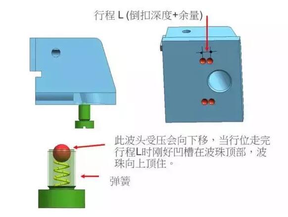 優(yōu)點(diǎn)為加工方便,操作簡單;缺點(diǎn)就是它容易損壞。常用于在X方向(水平)的小行位、行程偏大的行位。它還可以幫助行位延時(shí)開模,因?yàn)樾边厸]有起作用時(shí)波珠會頂住行位不讓動。
