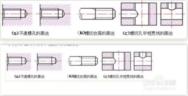 繪制不穿通的螺孔時,一般應將鉆孔的深度和螺紋部分的深度分別畫出,如圖3(a)。當需要表示螺紋收尾時,螺紋尾部的牙底用與軸線成30o的細實線表示,如圖3(b)。圖3(c)表示出螺紋孔中相貫線的畫法。