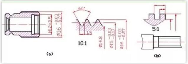 畫非標準牙型的螺紋時,應畫出螺紋牙型,并標注出所需的尺寸及有關要求,如圖5。