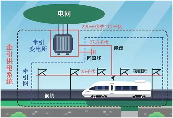 在我國電氣化鐵路中,使用的正是工頻(50赫茲)25(27.5)千伏單相交流電~這種單相、25(27.5)千伏的交流電是由牽引變電所將電網輸的電轉變而來。